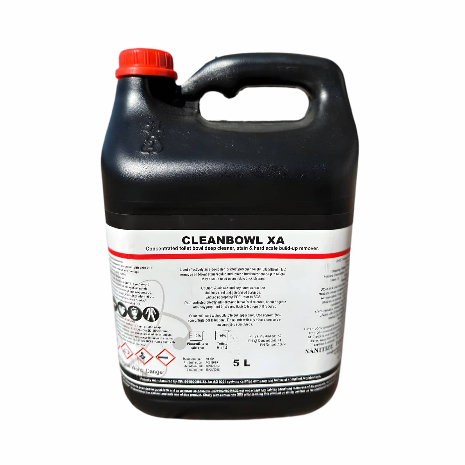 Clean Bowl XA 5L (Heavy Duty Toilet Bowl De-scaler )from Sanitize Today is a bathroom detergent and specialized toilet bowl cleaner for superior hygiene. Ideal for homes and businesses, it effectively removes stains and disinfects, leaving toilets clean and fresh. Trusted for its powerful cleaning action and pleasant fragrance, Clean Bowl XA 5L ensures a sanitized restroom environment with every use, promoting cleanliness and comfort.