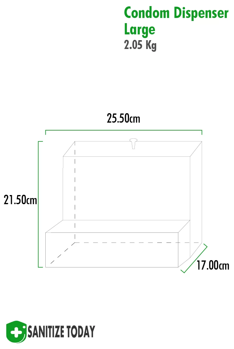 Our Condom Dispenser Large is made from powder coated mild steel which is wall mountable and holds approximately 200 Condoms. Dimensions: 203 (H) x 174 (W) 252(D)